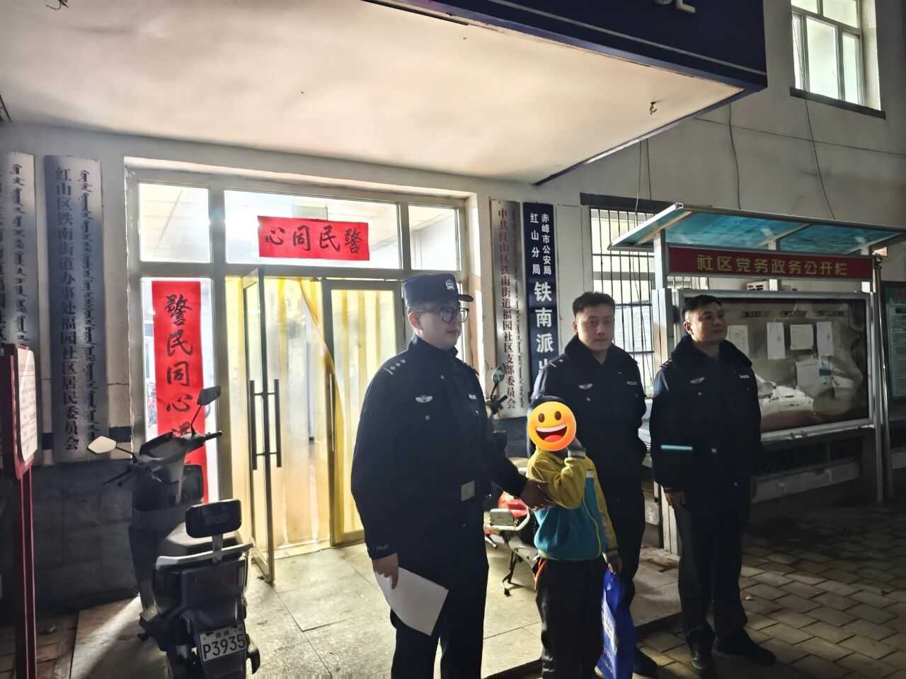 一场跨越松山、红山两区的寻人接力迅速汇合!玉龙派出所民警立即驱车赶往铁南派出所将小宇安全接回所内。