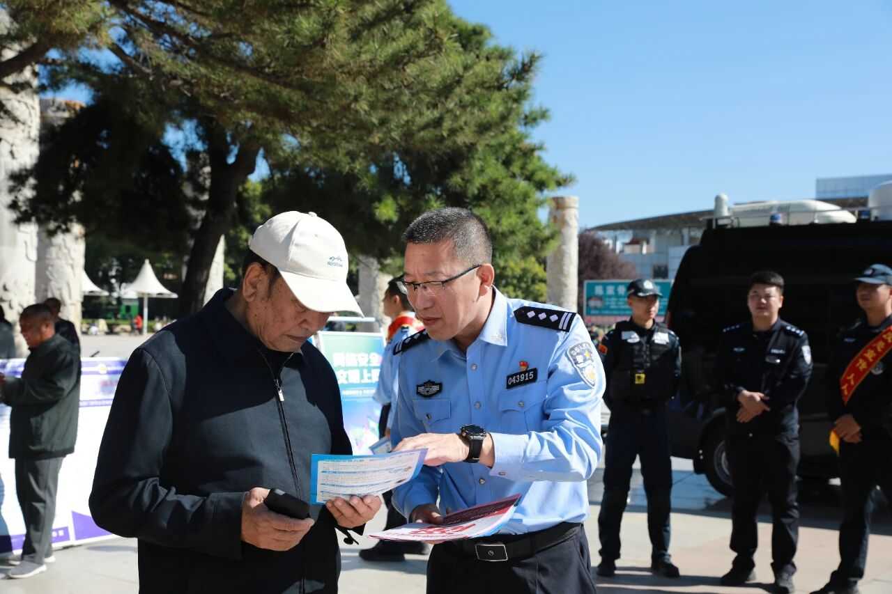 活动中,市局科信支队副支队长刘洪刚和三大队大队长井立国一行与分局民警辅警共同开展本次宣传,通过设立咨询台、摆放宣传展板、发放宣传资料等方式,向过往群众全方位普及网络安全知识。分局党委委员、副局长华正茂与分局各单位民辅警向群众讲解网络安全知识,面对面、零距离宣传普及打击预防网络谣言、网络赌博、网络诈骗等知识与相关法律。