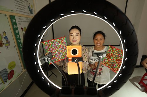 7月5日,在贵州省黔东南苗族侗族自治州榕江县场坝社区服务中心网络直播营销技能培训教室里,学员在直播营销刺绣手工艺品。新华社发(李长华