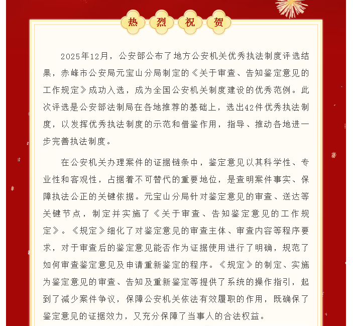 喜报!赤峰市公安局元宝山分局一项工作制度入选公安部优秀执法制度