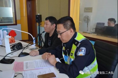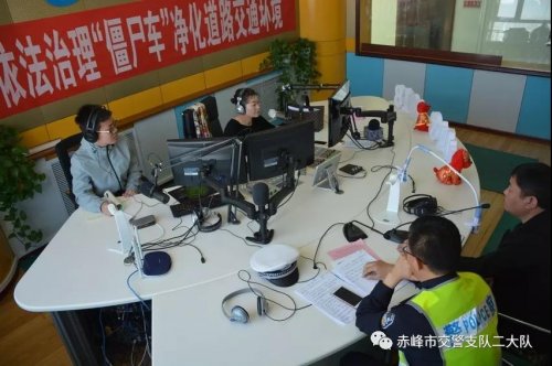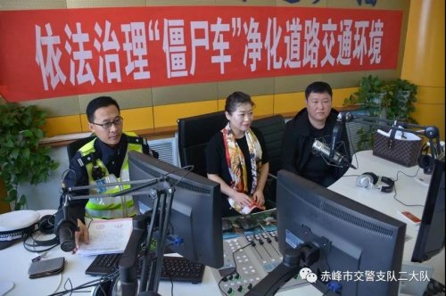 / 从左至右依次为: 交警支队二大队五中队中队长贾迪;赤峰交通广播直播间主持人闻晓;松山区城区管理综合执法局二大队大队长张继敏 /