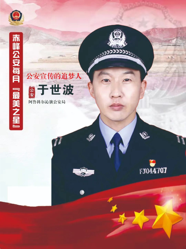 2020年7月,因工作业绩突出,旗公安局党委打破了辅警晋升的壁垒,任命于世波同志为旗公安局政治工作办公室新闻宣传中心副主任。2021年,他撰写的诗歌《国之利器》,入选在内蒙古公安厅《“我和警察的故事”优秀作品选集》;编导的2部廉政短视频,分别荣获全旗首届廉政短视频大赛“三等奖和优秀奖”。 笔铸金盾,情系草原。于世波同志的这种工匠精神,来自于他对公安新闻宣传事业的热爱、追求和执着,演绎了新时代青年警察的精彩人生。