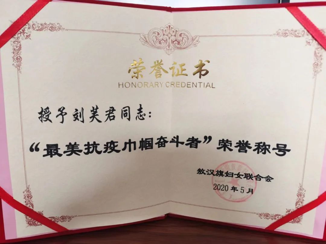 2020年5月,刘芙君被敖汉旗妇女联合会