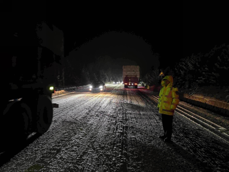 在省道105线陡坡、弯道、桥梁等关键路段,积雪结冰导致车辆滞留、通行缓慢。交管大队实时研判路况,将警力向国省道倾斜,在拥堵易发段、事故多发点设立临时执勤点,实行24小时动态值守,构建起全链条、网格化的疏导管控体系。
