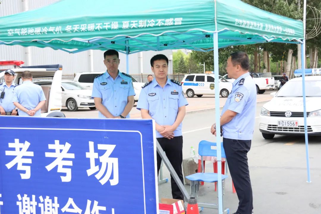 翁牛特旗公安局按照预案在考点周边道路科学设置交通管制区,放置静止鸣笛和禁止机动车辆驶入交通警示标志牌,及时清理道路两侧乱停乱放车辆,并对考点通道做好交通疏导、人员分流。考点执勤警力警容严整,在考点内外值守,配合查验证件,维护现场秩序,同时加强考点周边区域巡逻防控,确保考场及周边秩序井然。